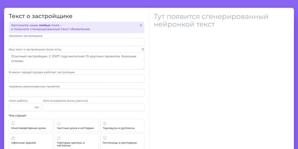 Здесь с помощью искусственного интеллекта вы можете написать уникальный текст о застройщике для продажи или аренды квартиры, дома, комнаты, апартаментов.