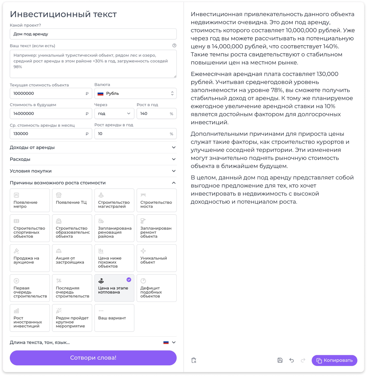 Далее указывается текущая стоимость объекта, валюта, стоимость в будущем, интервалы будущего, проценты роста в год, средняя стоимость аренды в месяц, рост аренды в год в процентах. Все данные в форме заполняются на ваше усмотрение — чем больше пунктов будут отмечены, тем больше исходного материала будет у нейронки, чтобы сформулировать интересный итоговый текст. Однако, все поля не обязательные — любое поле вы можете пропустить и не заполнять.