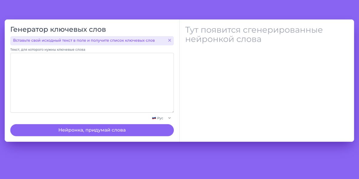 Форма «Генератор ключевых слов» состоит из одного поля, в которое вам необходимо вставить полный текст. Далее нажимаете кнопку «Нейронка, придумай слова», и искусственный интеллект после анализа текста выдаст вам список ключевых слов. Всё просто и быстро. Кроме того, ключевые слова можно получать на разных языках: сейчас доступны английский, французский, итальянский, белорусский и другие — просто выберете нужны флаг страны.