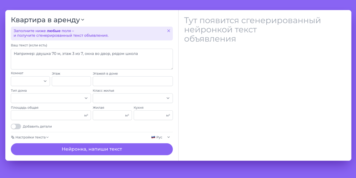Создавайте объявления по аренде квартиры легко и быстро. Просто отметьте нужны поля, а искусственный интеллект напишет красивое, качественное маркетинговое объявление. На одну квартиру можно получать несколько уникальных разнообразных текстов!
