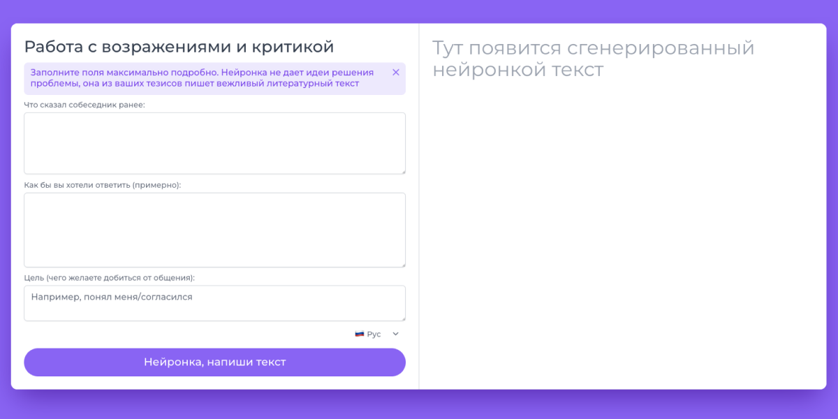 Блок «Работа с возражениями и критикой» состоит из трех полей. В первое поле «Что сказал собеседник ранее» вы вставляете полное длинное сообщение, которое получили от клиента. В поле «Как бы вы хотели ответить» пишите в любом формате свой ответ — с любыми эмоциями, которые накопились, всё, что приходит в голову (да, тут можно выговориться). В поле «Цель» доносите ясный и понятный ответ, чего именно вы хотите добиться при общении — холодная расчетливая четкая цель. И нажимаете кнопку «Нейронка, напиши текст».